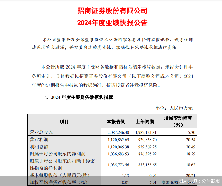 北京商报讯(记者 李海媛)1月17日,招商证券发布2024年度事迹快报公告。数据显现,2024年,招商证券齐全生意总收入208.72亿元,同比增长5.3%;齐全包摄于母公司推进的净利润103.67亿元,同比增长18.29%。